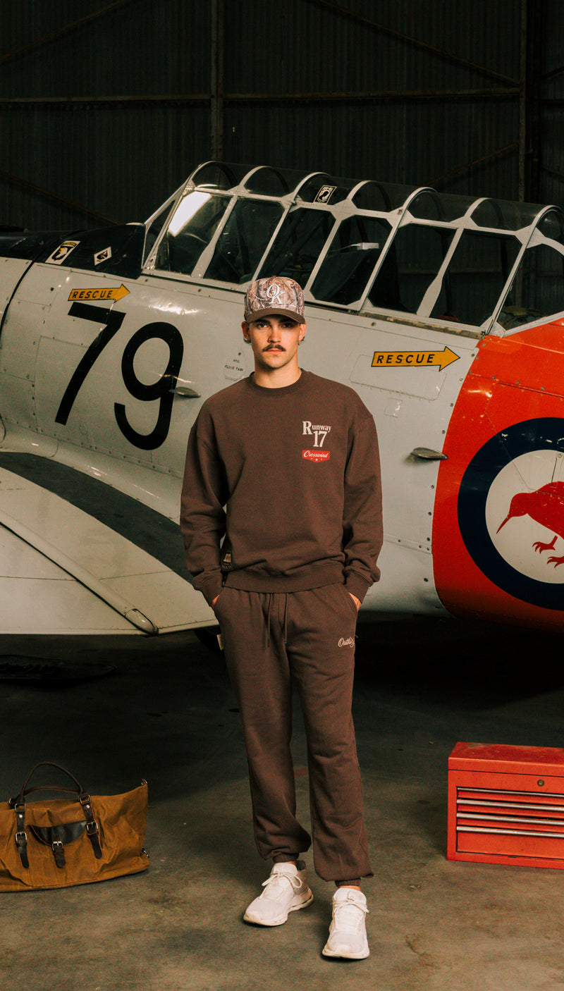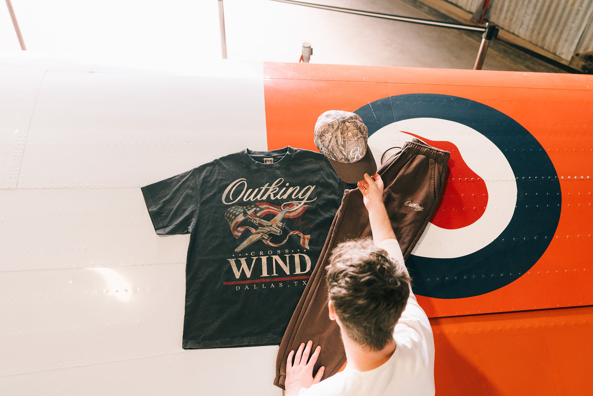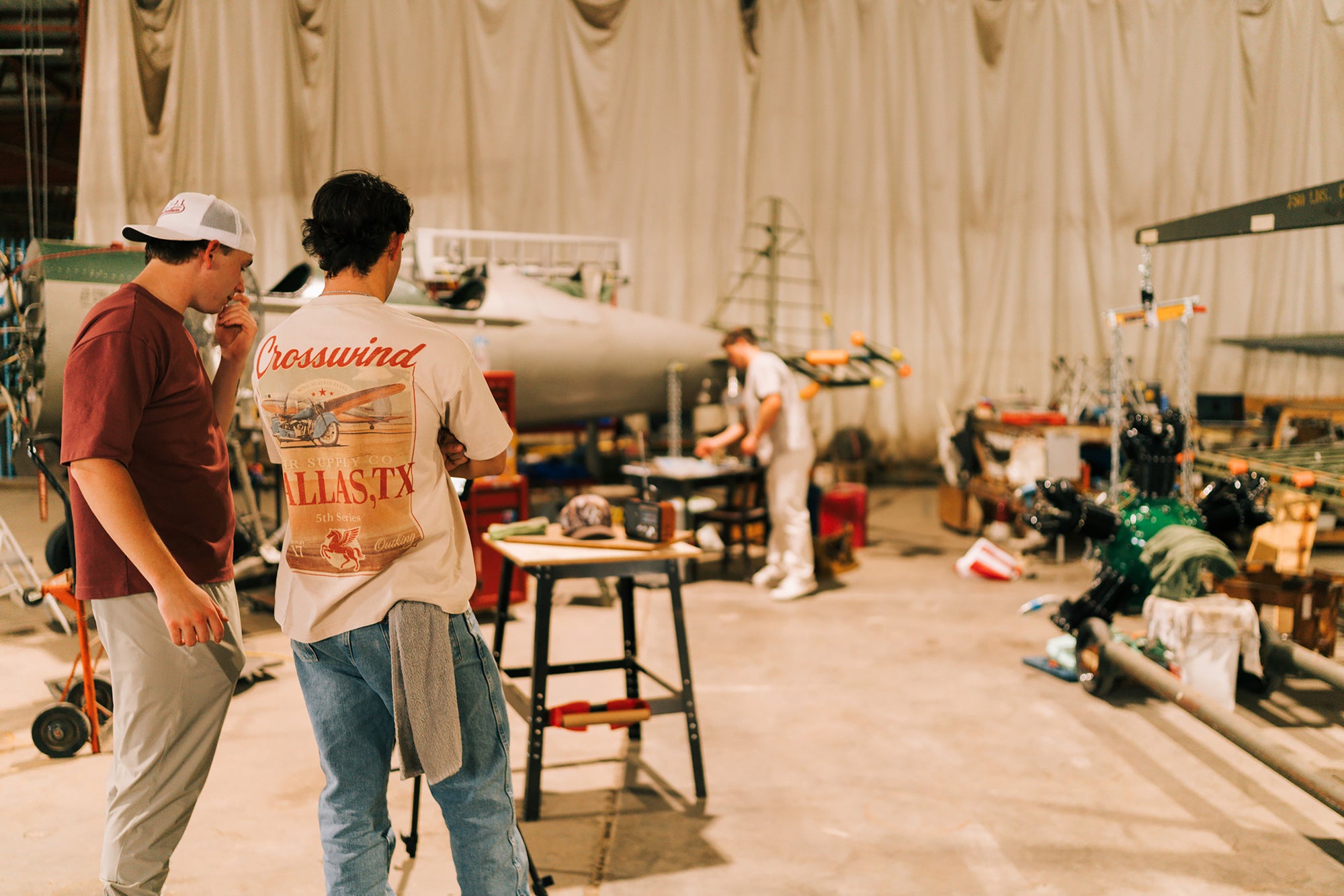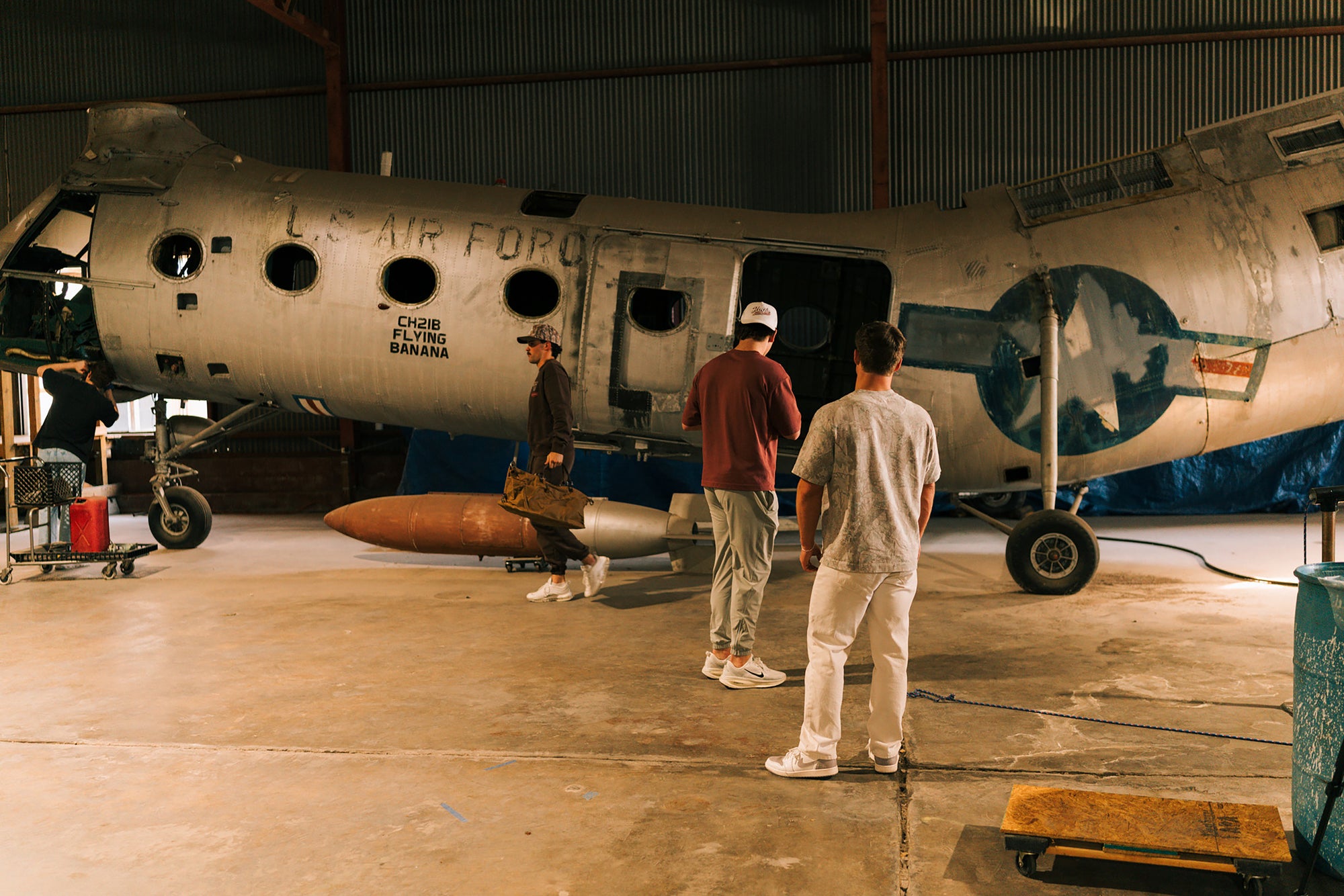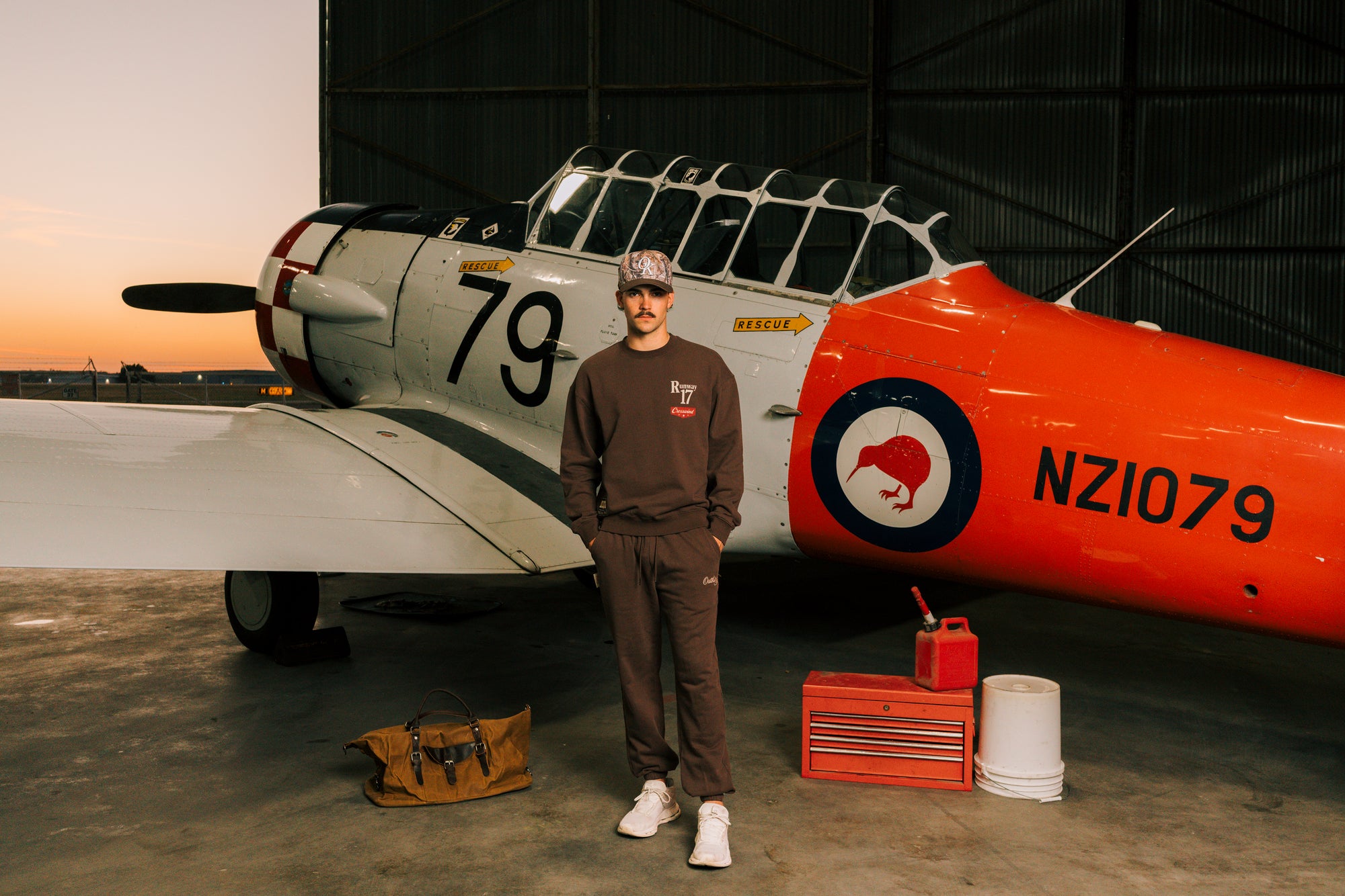 A hangar carries more than engines — it carries atmosphere. Here, the mood was shaped by weathered steel, late-day light, and the quiet weight of craftsmanship. Every look was captured in its natural surroundings, letting the setting speak louder than any styled scene.
